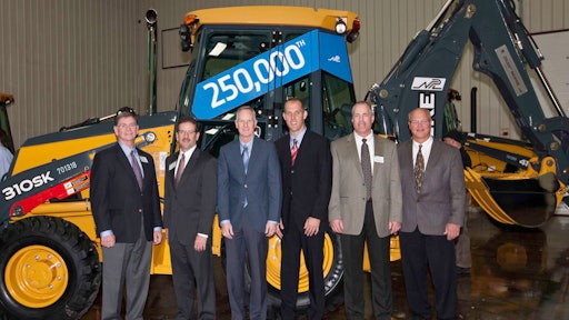 The John Deere Construction & Forestry Division has marked a production milestone with the completion of its 250,000th backhoe loader at the Dubuque Works factory. The model 310SK backhoe loader was purchased by Phoenix-based NPL Construction Co., who took delivery of the machine at a special ceremony at the Dubuque Works facility.