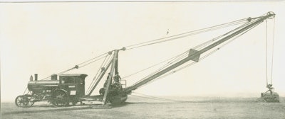The earliest example of this design known to this author is the Traction Steam Shovel and Crane built by Avery Company of Peoria, IL, circa 1909. While Avery called it a shovel, it was in fact a dragline, with 3/4- and 1-yard buckets offered for it, but designed like a guy derrick. This derrick was equipped with a 40-foot boom (or shorter, by special order), and Avery also built the steam traction engine that powered and moved it.