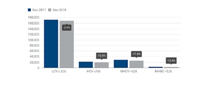 In December 2018, commercial vehicle registrations across the EU were down 4.0% compared to the last month of 2017.